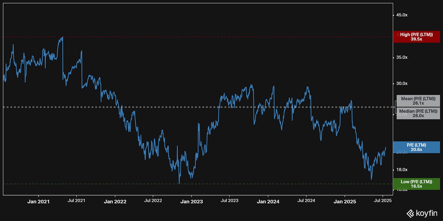 En conclusión, Alphabet cotiza actualmente a $183 por acción, con un múltiplo PER de 20,6x. Si el mercado volviera a valorar la empresa en línea con su media de los últimos cinco años (26x), el precio por acción podría alcanzar los $230.
