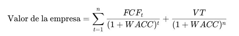 FCFt: Flujo de caja libre estimado para el año t, donde t representa el número de año dentro del horizonte de proyección (por ejemplo, t = 1 es el primer año, t = 2 es el segundo, y así sucesivamente).