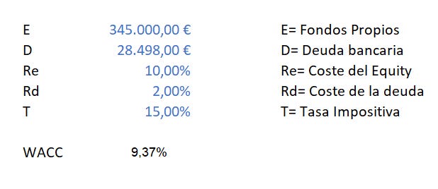Una tasa de descuento (WACC) del 9%, que representa el coste medio de financiación de la empresa —es decir, lo que le cuesta obtener capital, tanto mediante deuda como a través de fondos propios— y que, al mismo tiempo, refleja la rentabilidad mínima que exigen los inversores para compensar el riesgo de invertir en el negocio. Esta tasa se calcula aplicando la fórmula que explicamos anteriormente.