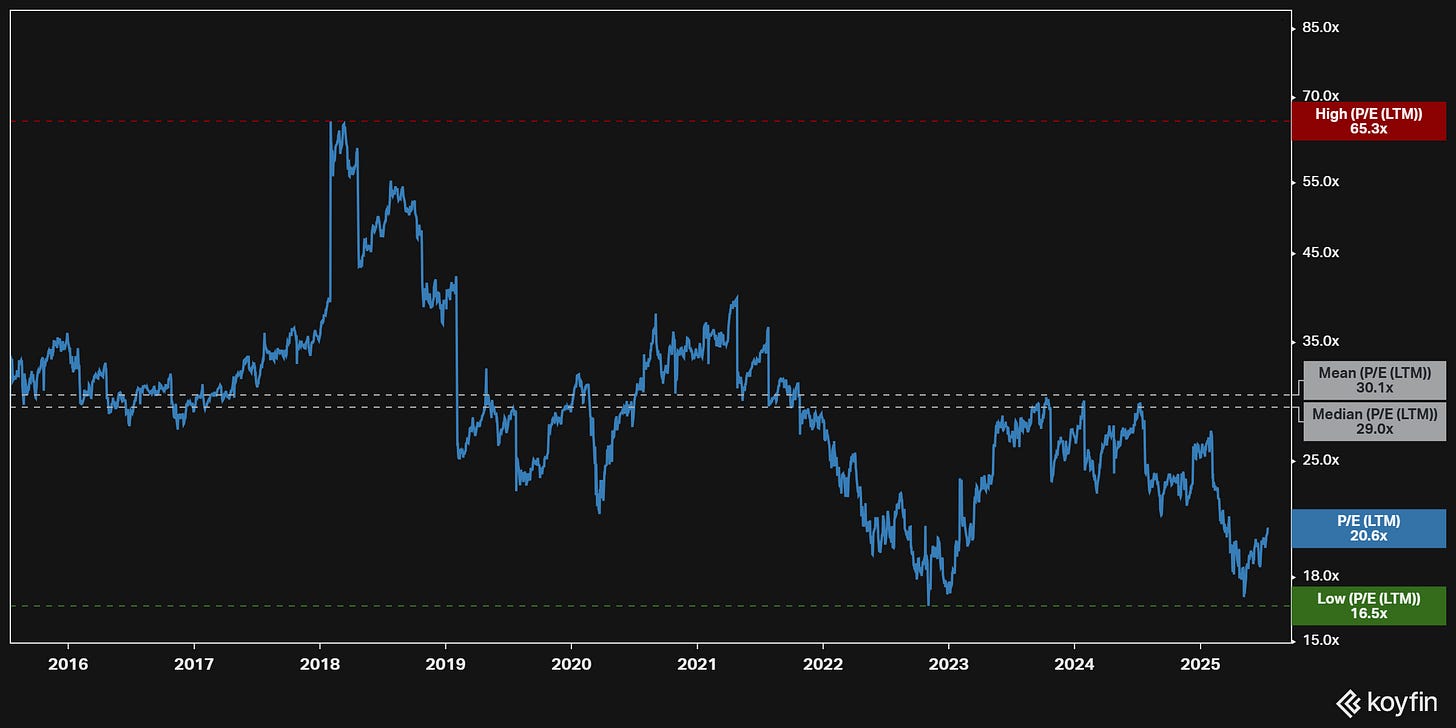 En los últimos 10 años, su media ha sido de 30,1x y la mediana de 29x.